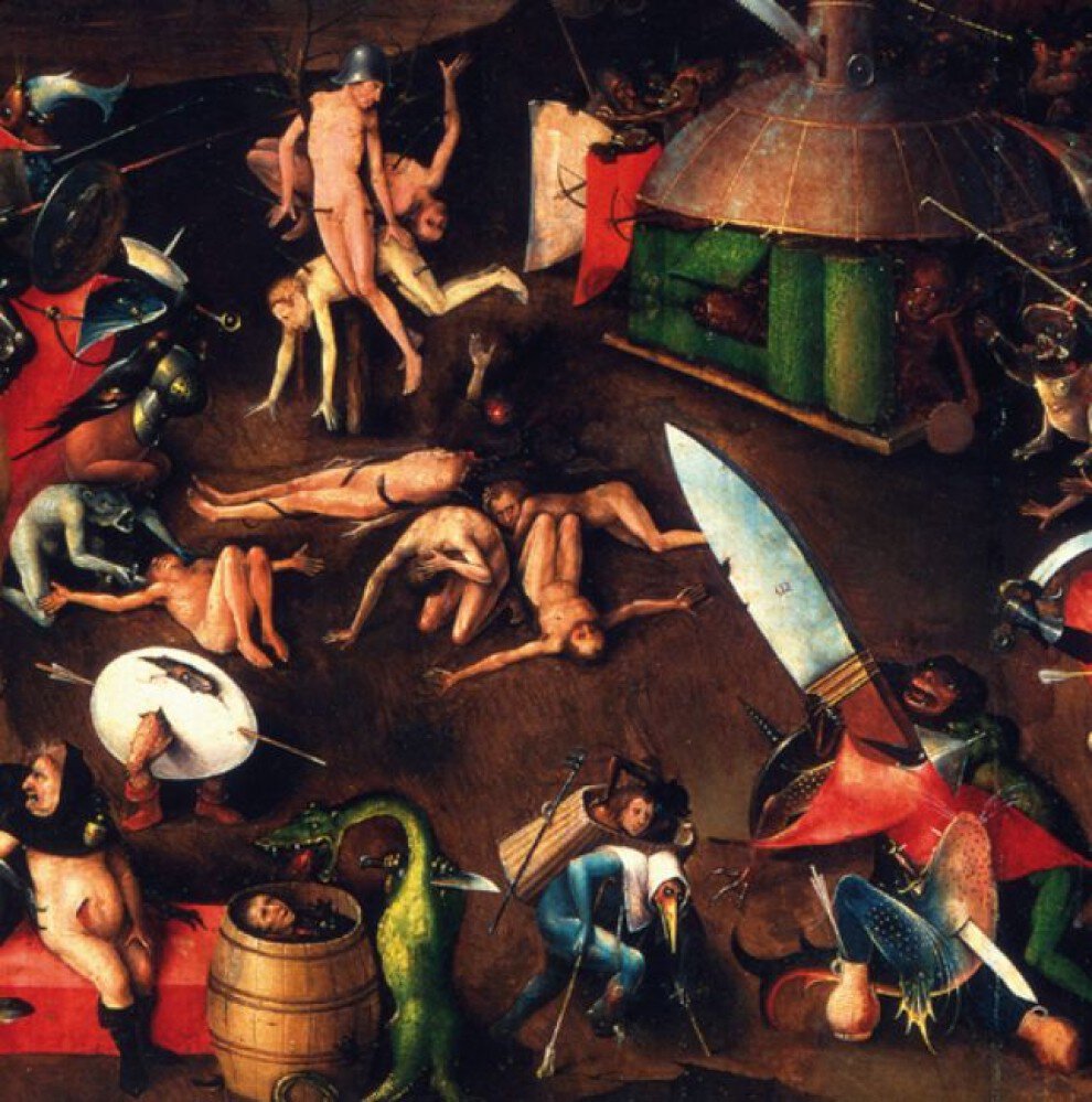 Hiëronymus Bosch warnt uns vor den Folgen eines sündhaften Lebens. Die gefallenen Engel auf dem linken Flügel lauten hier den Anfang vom Ende ein. Der Betrachter sieht die Schar einiger Auserkorener im Himmel, unter ihnen aber wimmelt der Rest der Nichtauserkorenen, die dann am Jüngsten Tag die schrecklichsten Folterungen über sich ergegen lassen müssen.