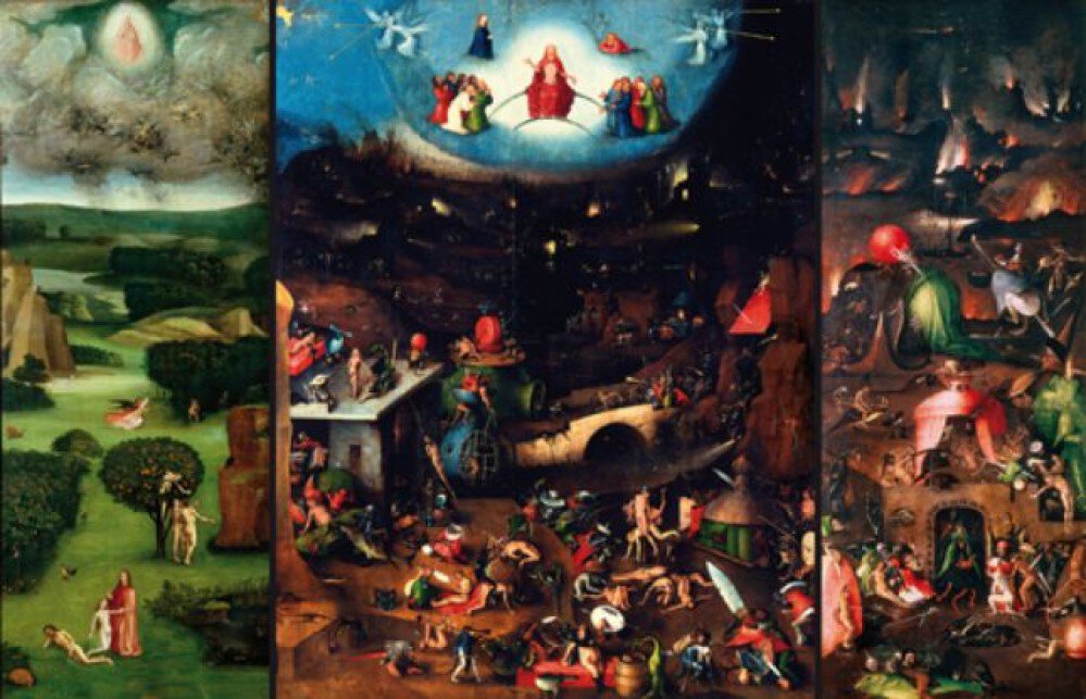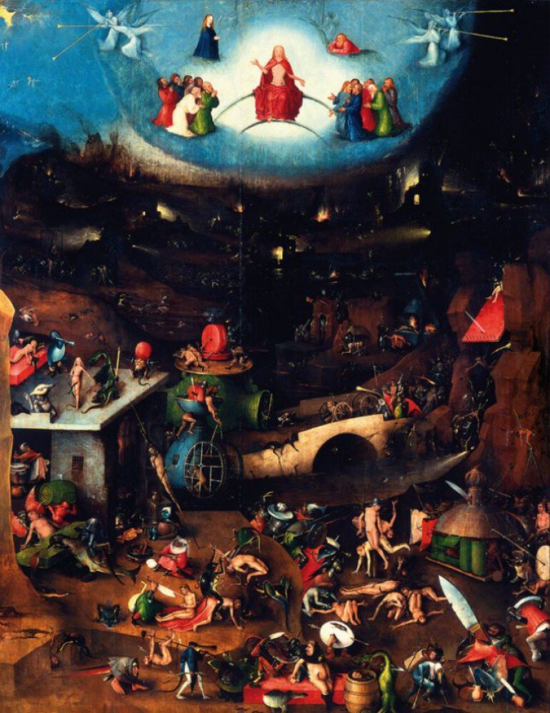 Hiëronymus Bosch warnt uns vor den Folgen eines sündhaften Lebens. Die gefallenen Engel auf dem linken Flügel lauten hier den Anfang vom Ende ein. Der Betrachter sieht die Schar einiger Auserkorener im Himmel, unter ihnen aber wimmelt der Rest der Nichtauserkorenen, die dann am Jüngsten Tag die schrecklichsten Folterungen über sich ergegen lassen müssen.
