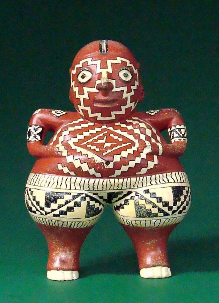 Fruchtbarkeitspuppe aus der mittelamerikanischen Chupícuaro-Kultur mit charakteristischer, dreifarbiger, geometrischer Verzierung.