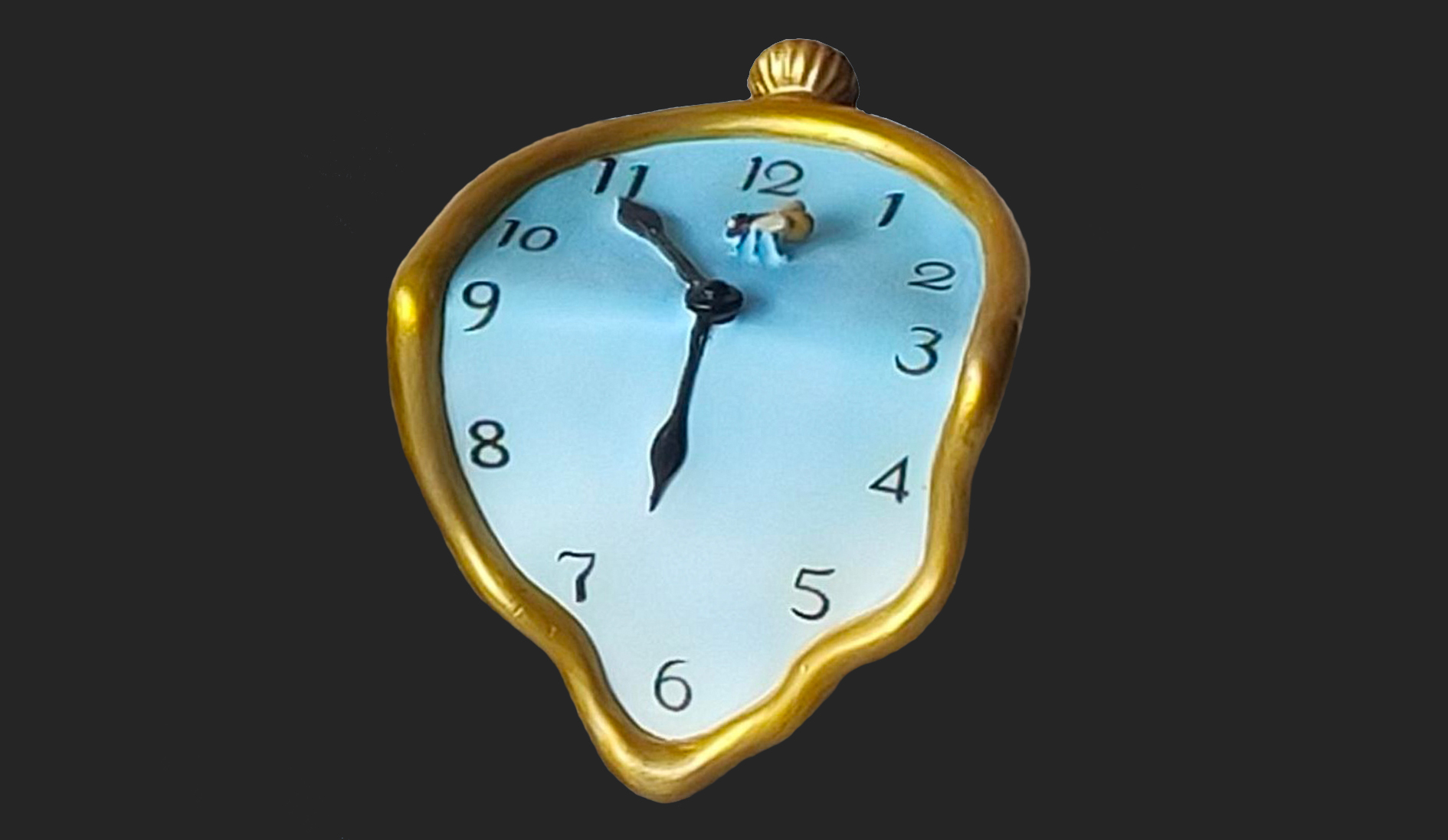 Die verzerrten Uhren scheinen zu verflüssigen, dargestellt als „der Camembert der Zeit“ im Sinne von Dalí, der die Fluidität und Instabilität der Zeit in Träumen oder veränderten Bewusstseinszuständen symbolisiert.