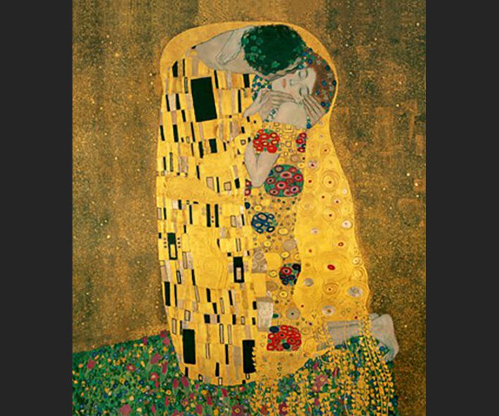 Hinter der Ornamentikfassade verbirgt zich lauteres, nahezu esoterisches Glück, auf klassische Weise in einem See von Blumen eingebettet. Es scheint, als ob die Geliebten auf eine für den Jugendstil so charakteristische Art und Weise völlig auf sich selbst zurückgezogen und außerhalb dieser Welt sind. Dieser Eindruck wird noch weiter vertieft durch die Verwendung von Goldfarben und Blattgold.