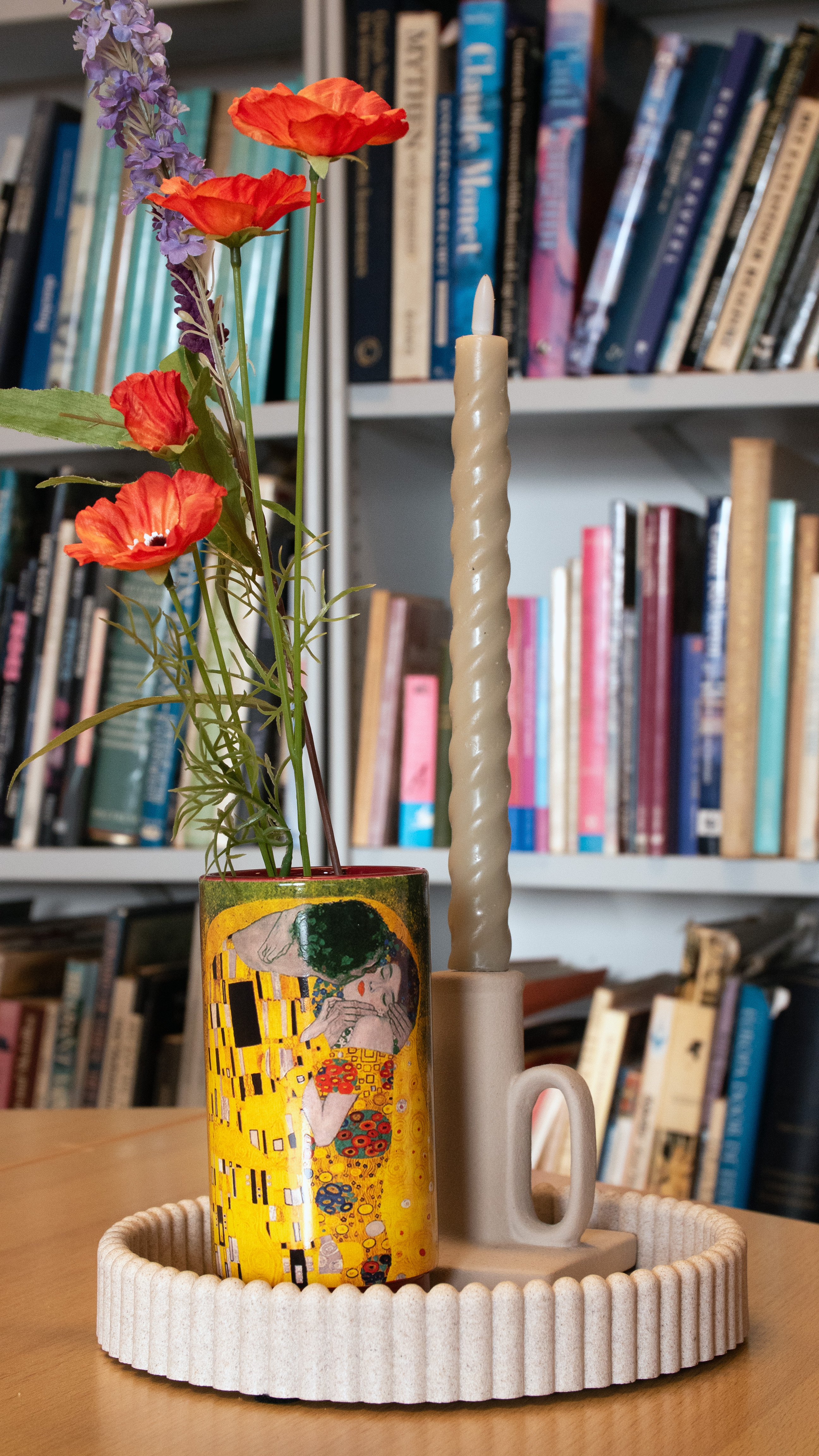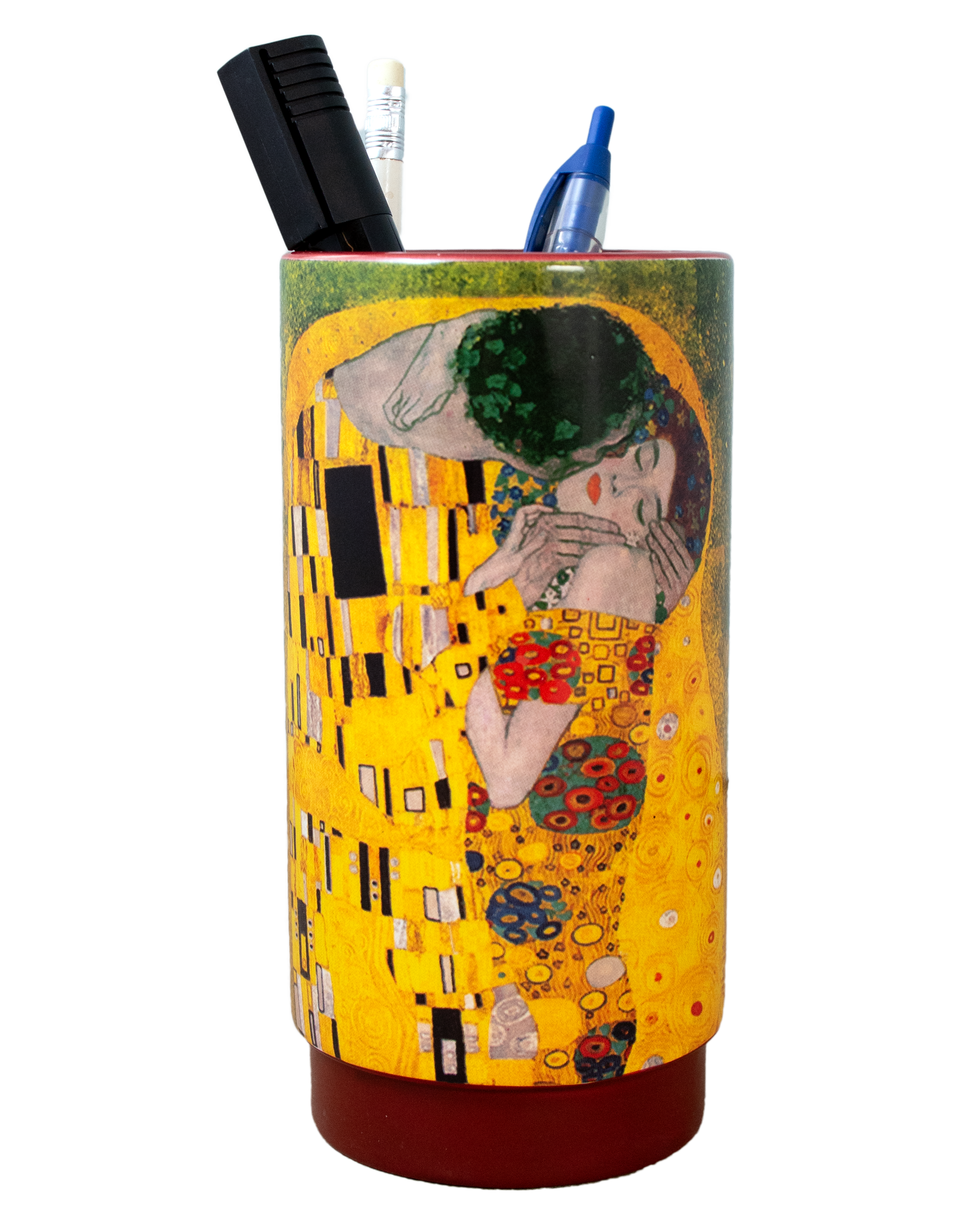 Bringen Sie die üppige Pracht von Gustav Klimt auf Ihren Schreibtisch mit unserem Stifthalter mit dem Motiv Der Kuss (1907–1908). Dieses ikonische Meisterwerk aus Klimts Goldener Periode strahlt pure Wärme und Intimität aus. Die Kombination aus reichhaltigem Blattgold, dekorativen Mustern und weichen, umhüllenden Formen macht Der Kuss zu einem der beliebtesten und bekanntesten Gemälde der Welt. In diesem Werk fängt Klimt einen zeitlosen Moment der Liebe ein, vollständig umhüllt von Glanz, Symbolik und Eleganz.