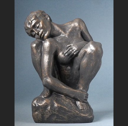 Wie ‘Der Denker’und viele andere bekannte Skulpturen basiert auch ‘Die hockende Frau’ auf einer Figur aus dem Tympanon des Höllentors, einem Bronze portal für das Musée des Arts Décoratifs, das nie zur ursprünglichen geplanten Ausführung gelangte. Dort stellt sie in ihrer kraftvollen und zugleich verletzlichen Haltung als Karyatide eine der verlorenen Seele dar.