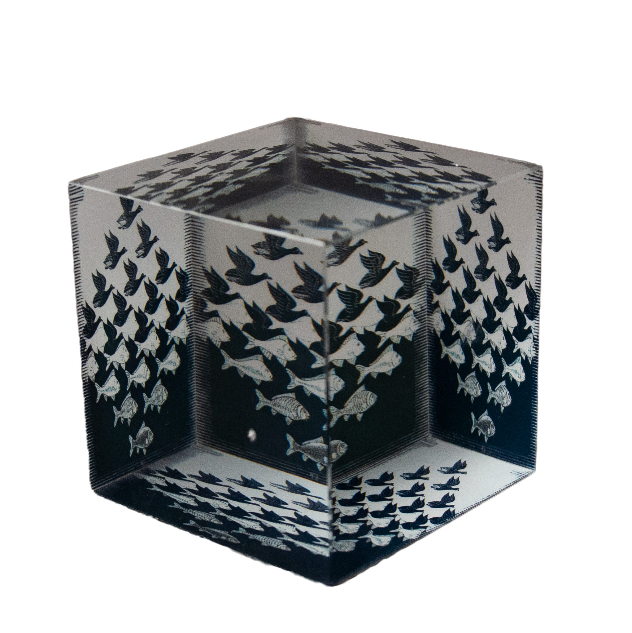 Bringen Sie ein Stück beeindruckende, mathematisch inspirierte Kunst in Ihr Zuhause mit diesem wunderschönen Air and Water-Paperweight aus unserer QB-Art Kollektion. Das ikonische Meisterwerk von M.C. Escher erwacht in einem faszinierenden kaleidoskopischen Effekt zum Leben, der mit Form, Linie und Tiefe spielt.