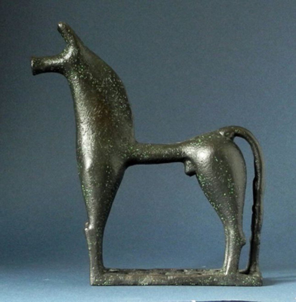 Rund 900 v. Chr. Kam es in der altgriechischen Kunst zu einem stilwandel. Sowohl in Dekorationen als auch in der Bildhauerkunst entwickelten sich geometrische Muster, die sich komplett von dem bis daher vorherrschenden vorhellenische Stil unterschieden. Maler begannen, die Keramiken mit stilisierten, eingezeichneten Silhouetten zu verzieren, ein Stil, der schon nach kurzer Zeit von Bildhauern adoptiert wurde. Sas Pferd war ein hervorragendes Object für diese innovatieve, geometrische Simplifizierung. Jede Bronzegießerei auf dem griechischen Festland entwickelte ihre eigene Variation, aber als charakteristische Elemente behaupteten sich überall der “Schweinerüssel”, die spitzen Ohren und die dreieckigen Aussparungen im Fuß der Skulptur. Manchmal dienten die Pferdchen als Ornamente auf Vasen, aber in den meisten Fällen handelte es sich um originäre Skulpturen, die vielfach als Grabsatuen verwendet wurden.