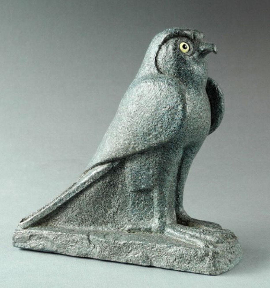 (715 – 332 v.Chr.). Der Falkengott Horus ist einer der ältesten und bekanntesten ägyptischen Götter. Schon in der prädynastischen Zeit, im 4. Jahrtausend v. Chr., wurden dem Falken kosmische Kräfte zugeschrieben. In der hoch komplizierten ägyptischen Götterweld nahm der Falke in den anschließenden Jahrhunderten eine führende Position ein, obwohl sich sein Rang und siene Bedeutung abhängig von Ort und Zeit häuftig änderten. Die Skulptur stammt aus der Späten Periode, einer turbulenten Zeit, in der das bereits geteilte Ägypten von den Persern erobert wurde. Diese wurden wiederum von Alexander dem Großen vertrieben, wodurch Ägypten zu einem Teil des hellenistischen Reiches wurde. Der Falke wurde in Koptos, einer wichtigen Stads in Oberägypten und Ausganspunkt der Handelsrouten zum Roten Meer, gefunden. Einder der eingelegten Elfenbeinaugen is verlorden gegangen.