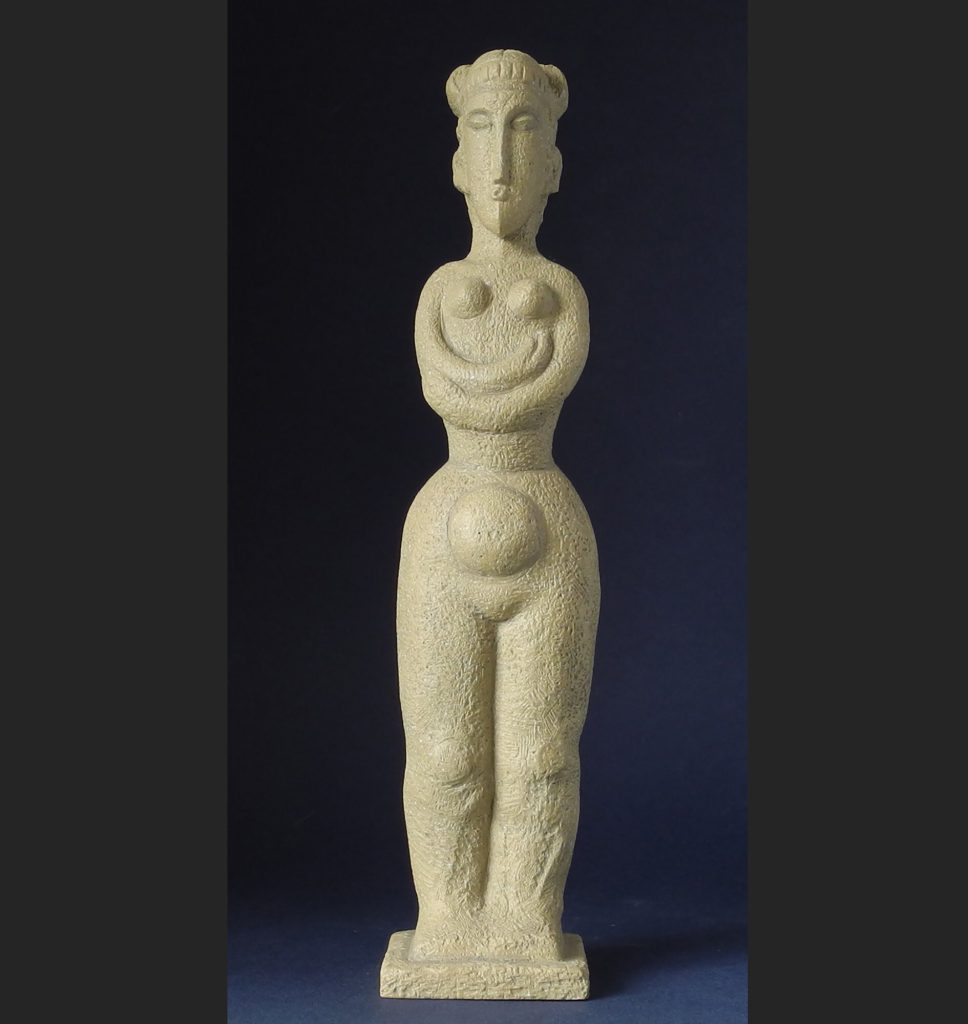 At a young age, Modigliani travelled to the stone quarries of Carrara to become skilled in the art of sculpting. Later he got fascinated by the traditional sculptures from Africa and Oceania.As far as is known to us, Modigliani made 24 sculpted heads, and only two complete human figures which both have the characteristics of a caryatid. The sculpture, which was originally made from lime stone, is, with a height of 1.6 metres, the largest one he has ever made. It shows a mixture of archaic styles, ranging from Cycladic to Cambodian.
