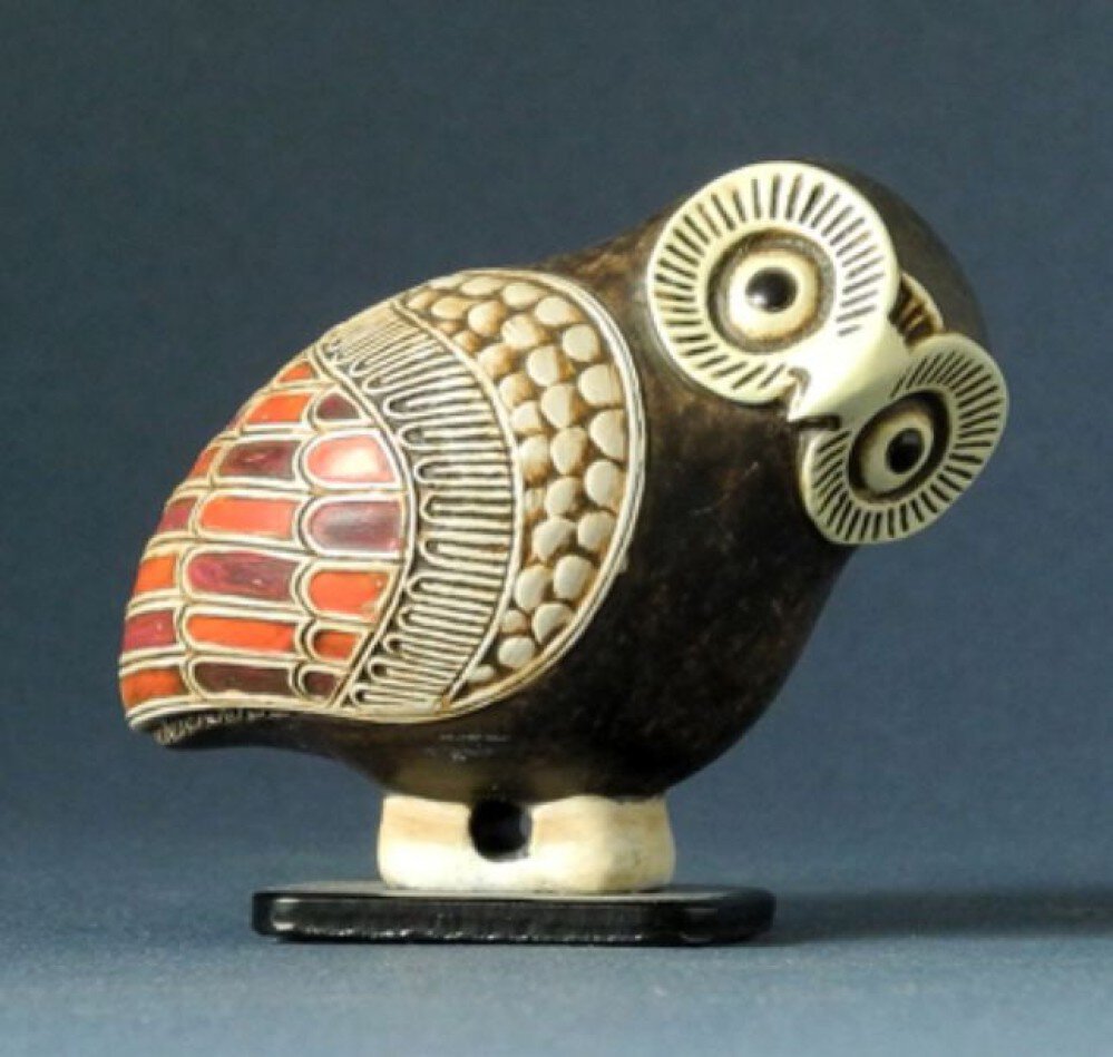 Im 7. Jh. Entwickelte Korint einen eigenen Stil in der Keramikherstellung. In den beiden Jahrhunderten davor hatte der von Athen diktierte geometrische Stil dominiert. Aus dem aufblühenden Handel mit Gebieten im Osten von Griechenland ging die orientalisierte Ausschmückung hervor, die sich vor allem durch die Verwendung van Pflanzen- und Tiermotiven kennzeichnet. In der späprotokorinthischen Epoche kam es unter den Töpfern und Kunsthandwerkern zu einer Specialisierung auf die Herstellung kleiner Aryballoi, kleinen Gefaßen für Öl und Parfüm, die sich leicht ausführen ließen. Die Grundform der Eule, die das Sinnbild der Göttin Pallas Athene darstellt, ist aus einem Modell gefertigt. Die stilisierte Verzierung zeugt von großem handwerklichen Können und ausgeprägter künsterischer Ausdruckskraft. Durch das Loch im Fuß der Eule kann ein band gezogen werden, an dem das Gefäß aufgehängt werden kann. Außerden lässt es sich so im Badehaus einfach am Handgelenk tragen.