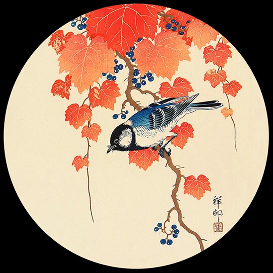 Der Japanische Künstler Koson war ein Mitglied von die Shin-hanga-Bewegung, der der alten Holzschnittkunst neues Leben ein hauchte. Er richtete sich auf dem Entwurf von Holzschnitten mit dem beliebten Thema „kashÅ-ga“ (Blumen und Vögeln).