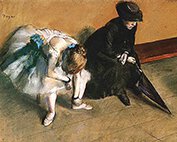 Degas war bereits in jungen Jahren an Ballet interessiert. In 1872 fertigte er Seine ersten Studien zu Balletttänzerinnen an. Er vermied dabei die wirkliche Dramatik, den Auftritt. Diese distanzierte Betrachtungsweise scheint die Wiederspiegelung des Lebens von Degas zu sein. Als eine kleine Tänzerin, ein Lieblingsmodell, nach New York abreiste, reiste der scheinbar gleichgültige Junggeselle ihr auf dem ersten Schiff hinterher, um letztendlich ohne das Schiff in New York verlassen zu haben, nach Frankreich weider zurückzukehren. “Was kann einer mehr tun als zu zeigen, dass man es in sich hat, einer Dame von Paris nach New York zu folgen?”