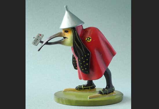 Das Monstrum, einem Briefträger ähnlich, besorgt vielleicht einen Brief bei den Figuren, die zusammen wie Verschwörer im Eisloch unter der Brücke stehen.