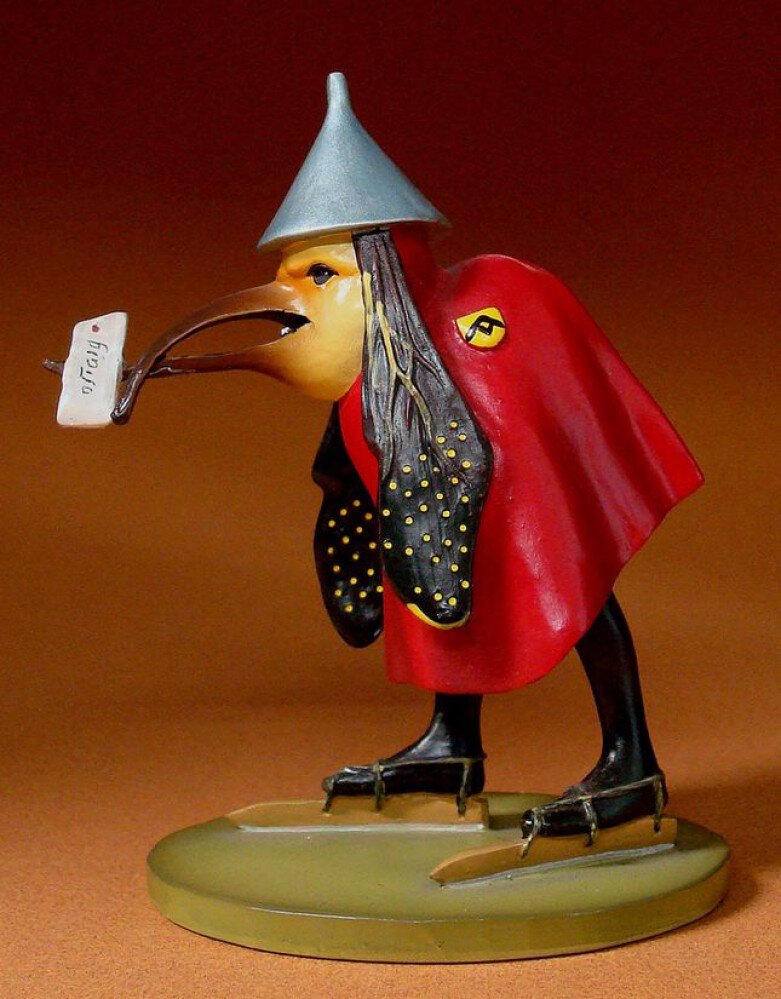 Das Monstrum, einem Briefträger ähnlich, besorgt vielleicht einen Brief bei den Figuren, die zusammen wie Verschwörer im Eisloch unter der Brücke stehen.